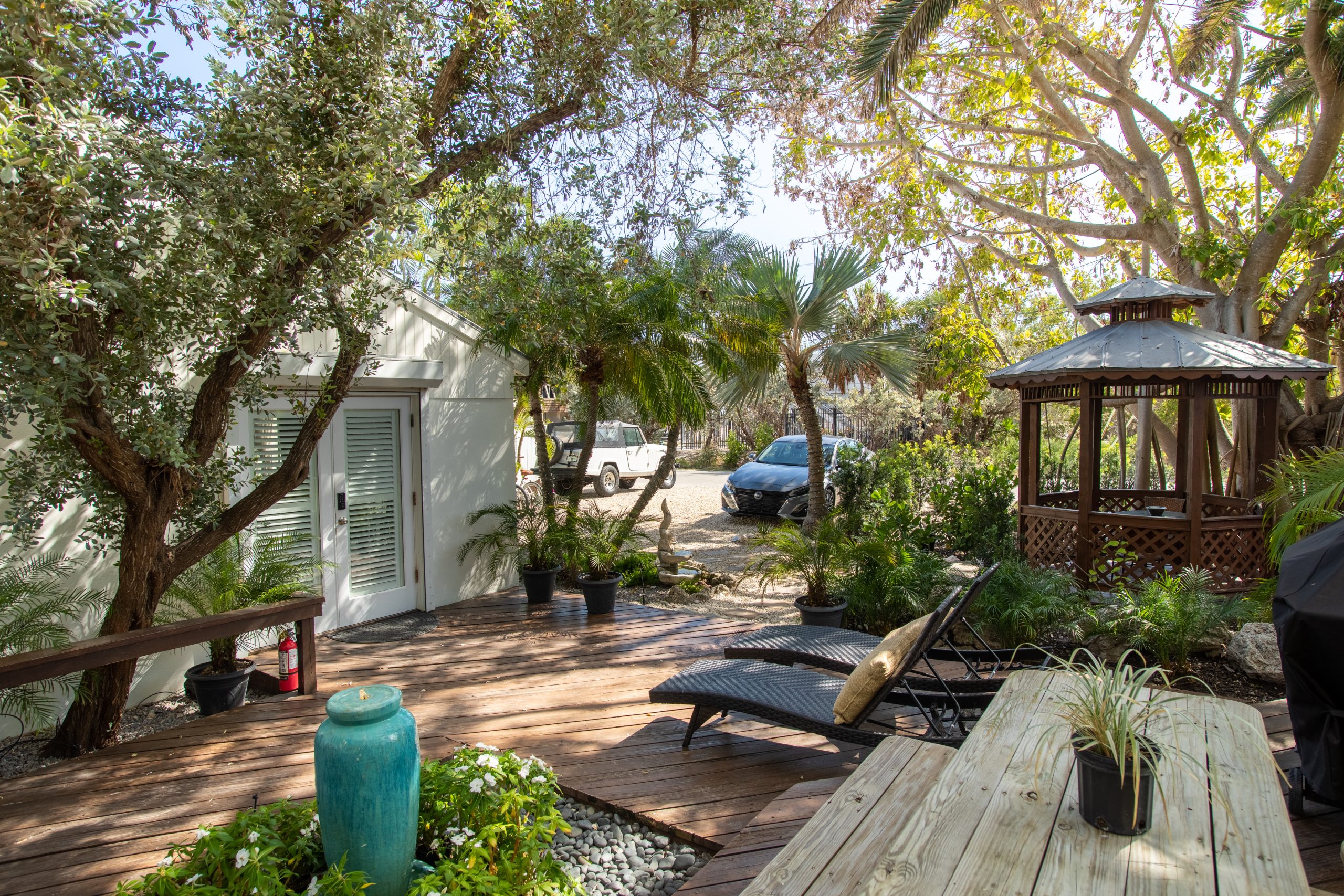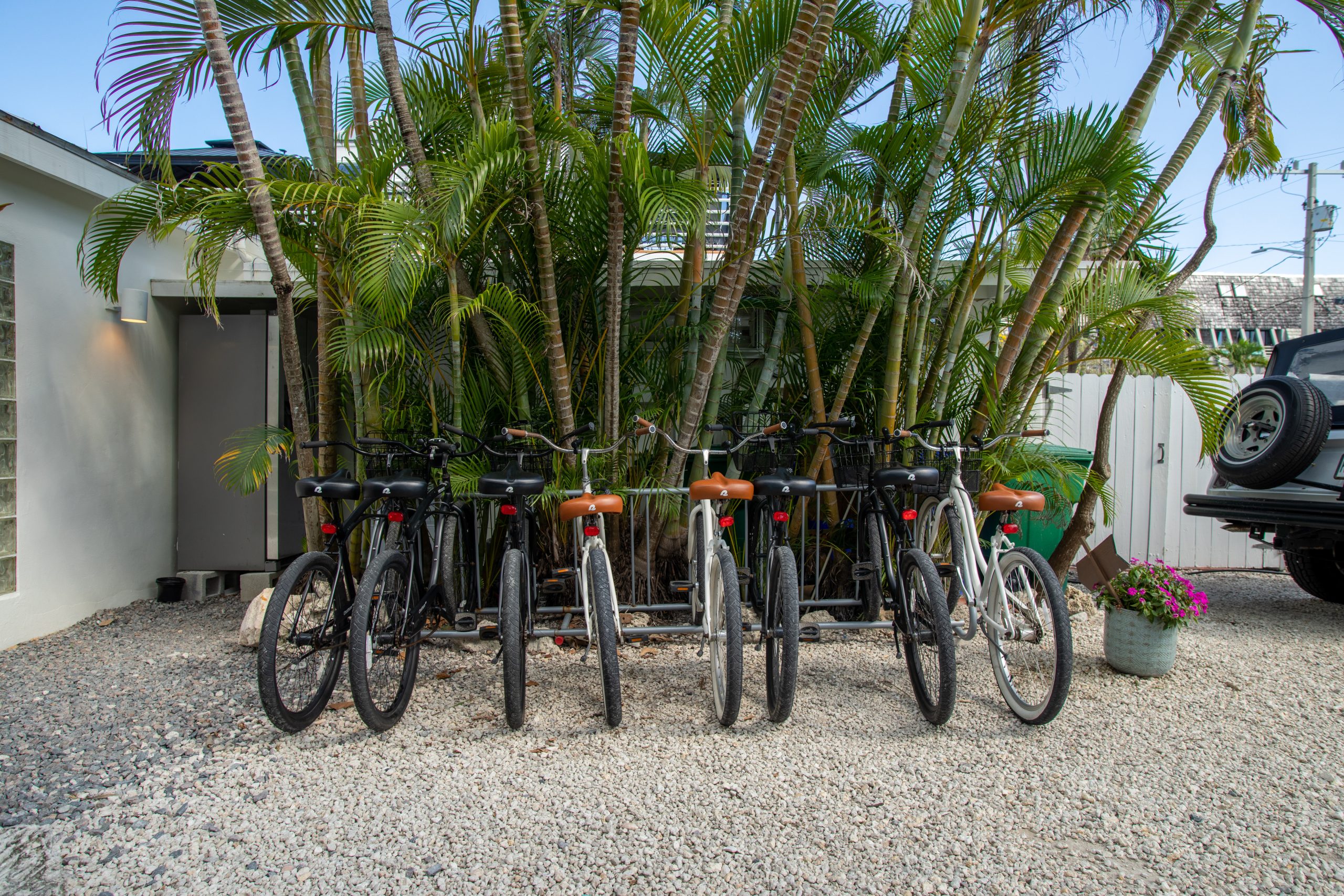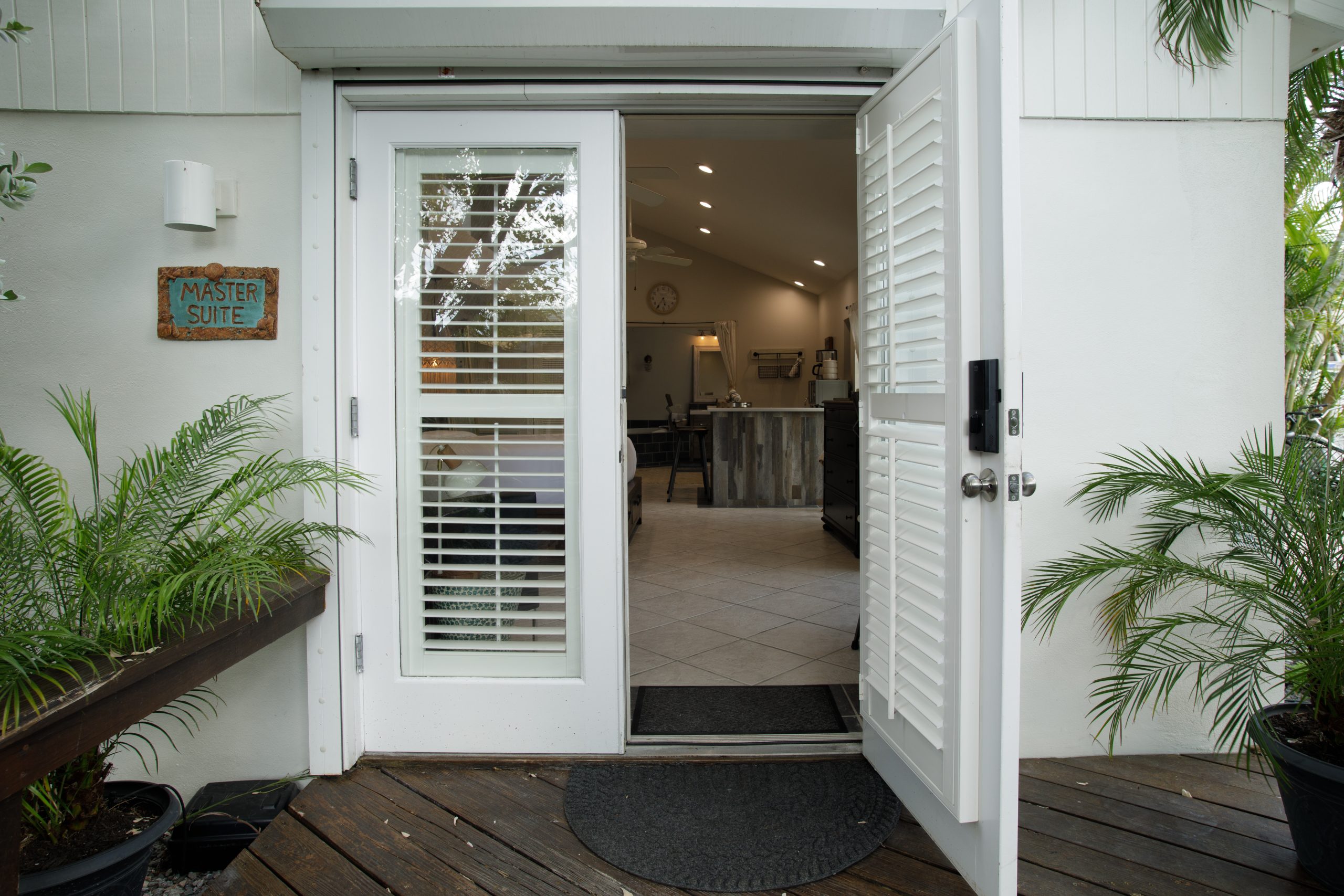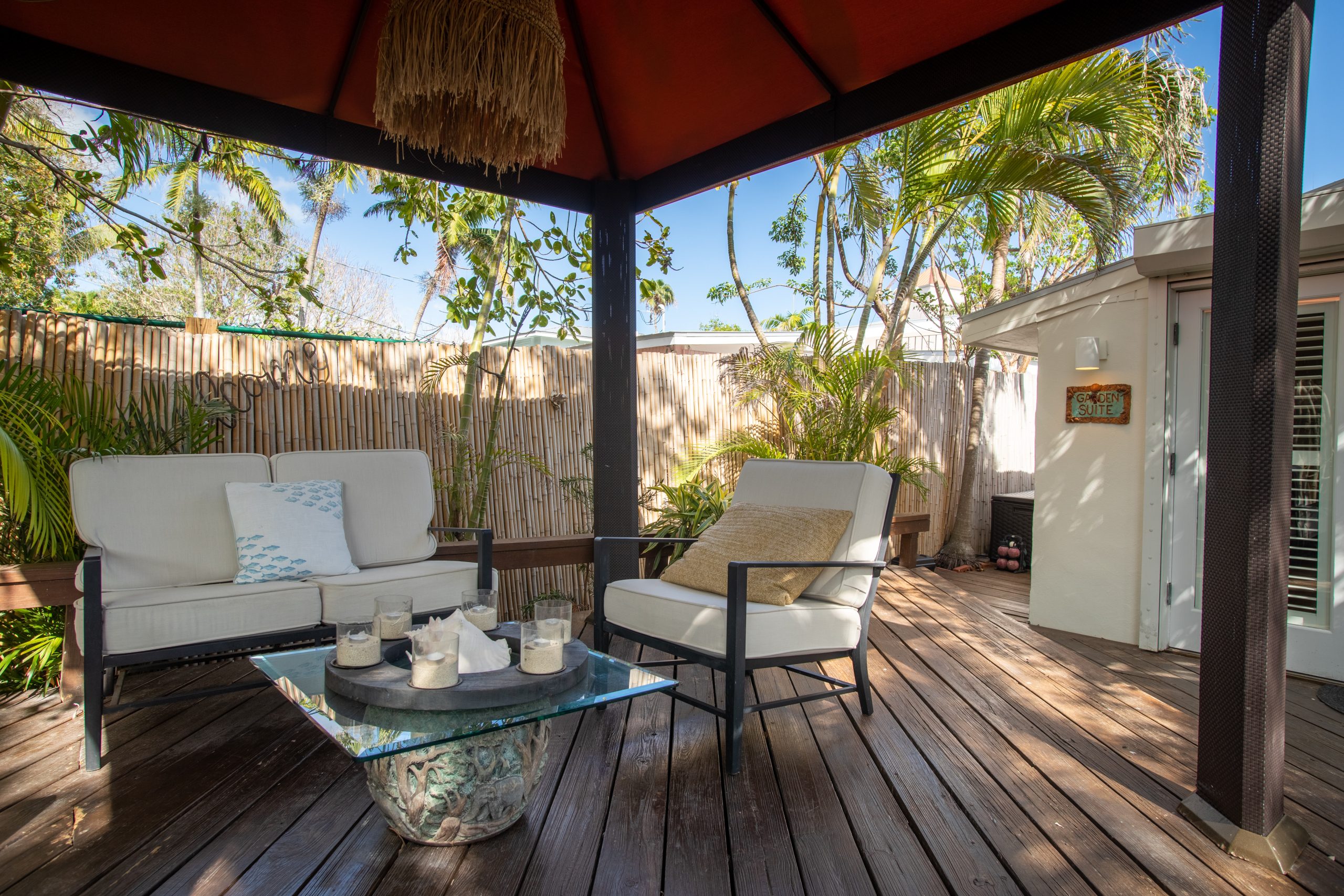 Please Note: The Palm Suite is one of only two guest suites, separate from the Main Residence. The two suites have exclusive use of the lush backyard oasis with tropical trees, plenty of seating areas to enjoy dining alfresco while taking in the natural sounds of local wildlife. There is also a shared propane BBQ on the deck and an additional refrigerator with extra storage and ice located next to the complimentary cruiser bikes! The Palm and Banyan Suites each accommodate a maximum of 2 adults – Special accommodations for children may be made if both guest suites are booked together.
