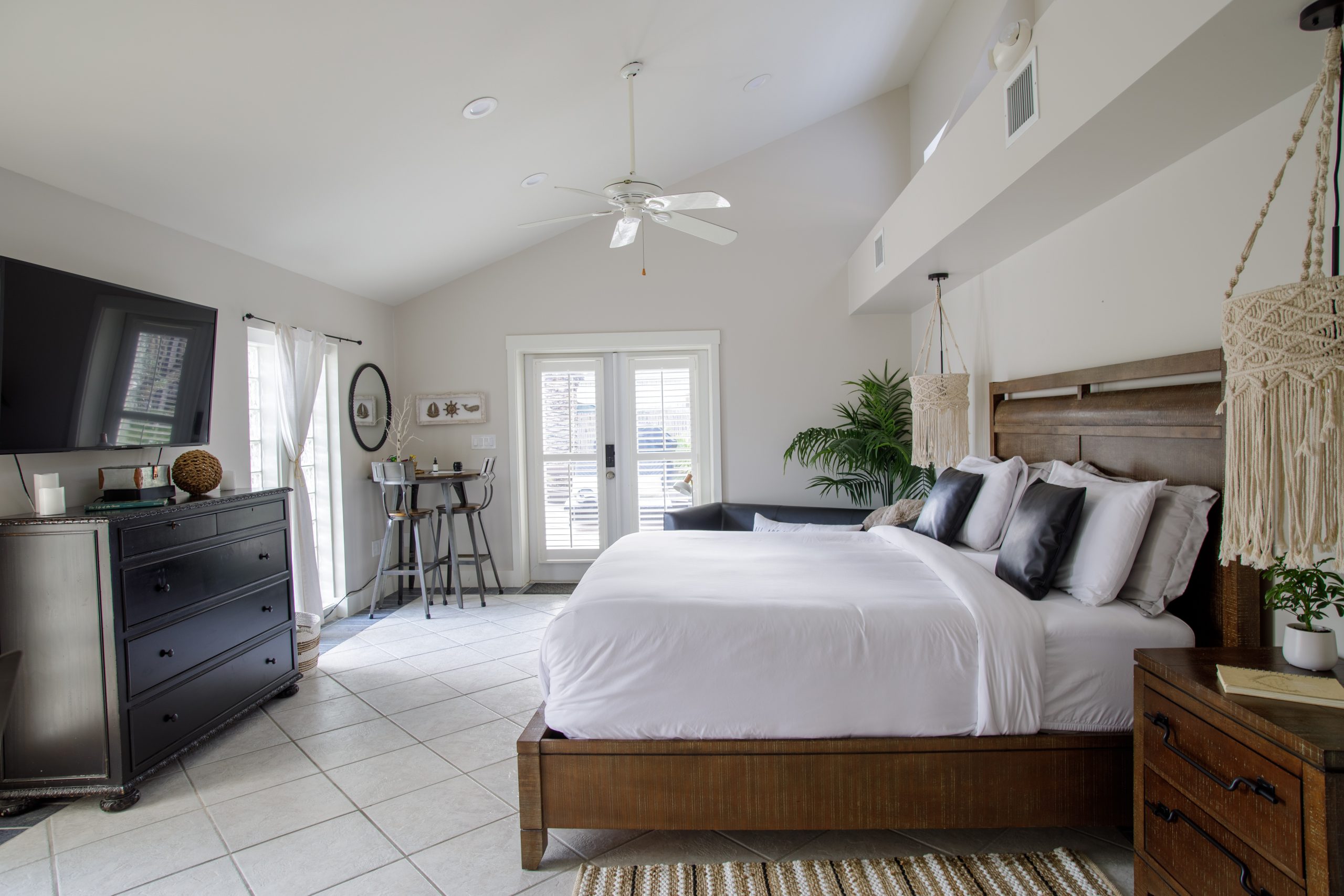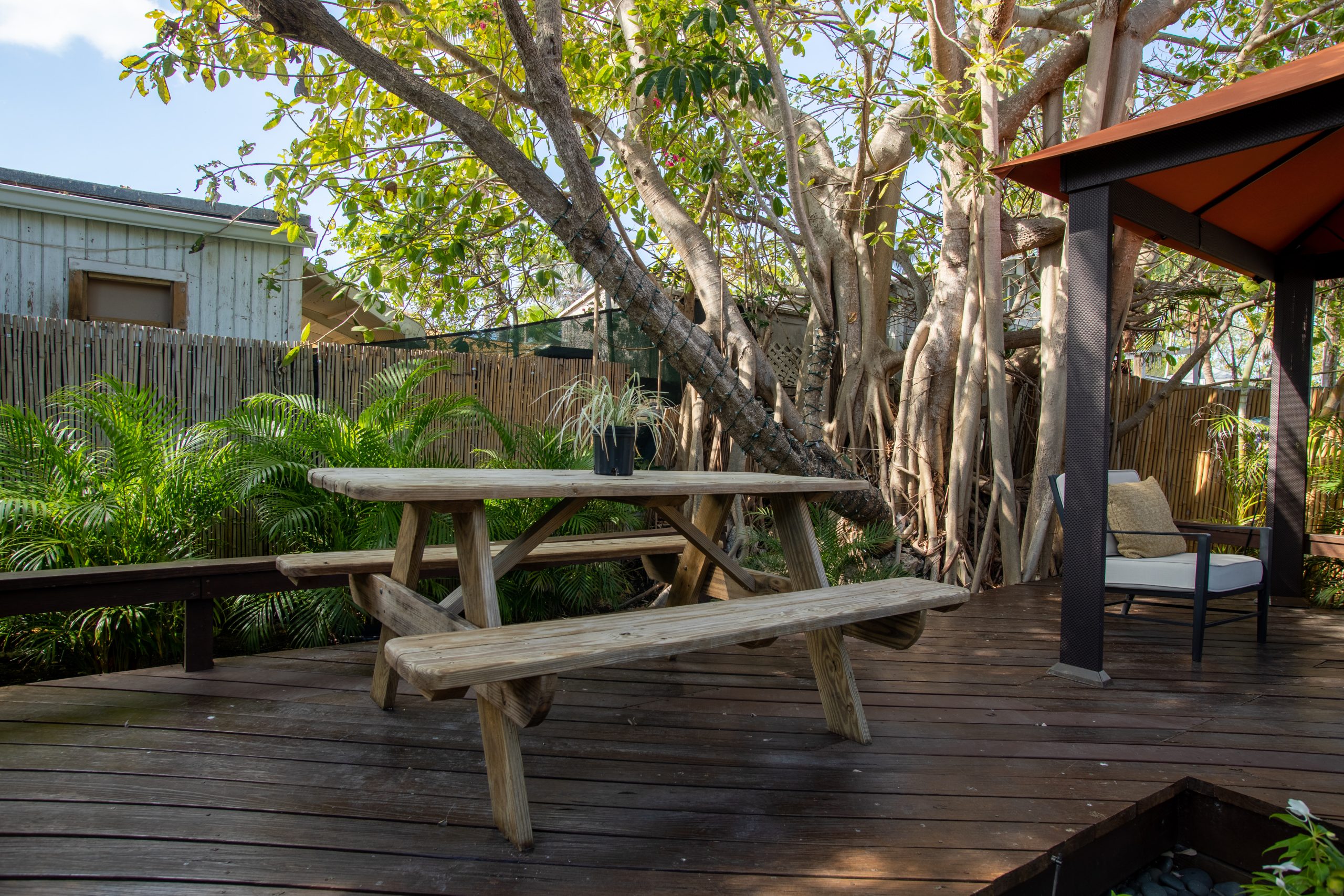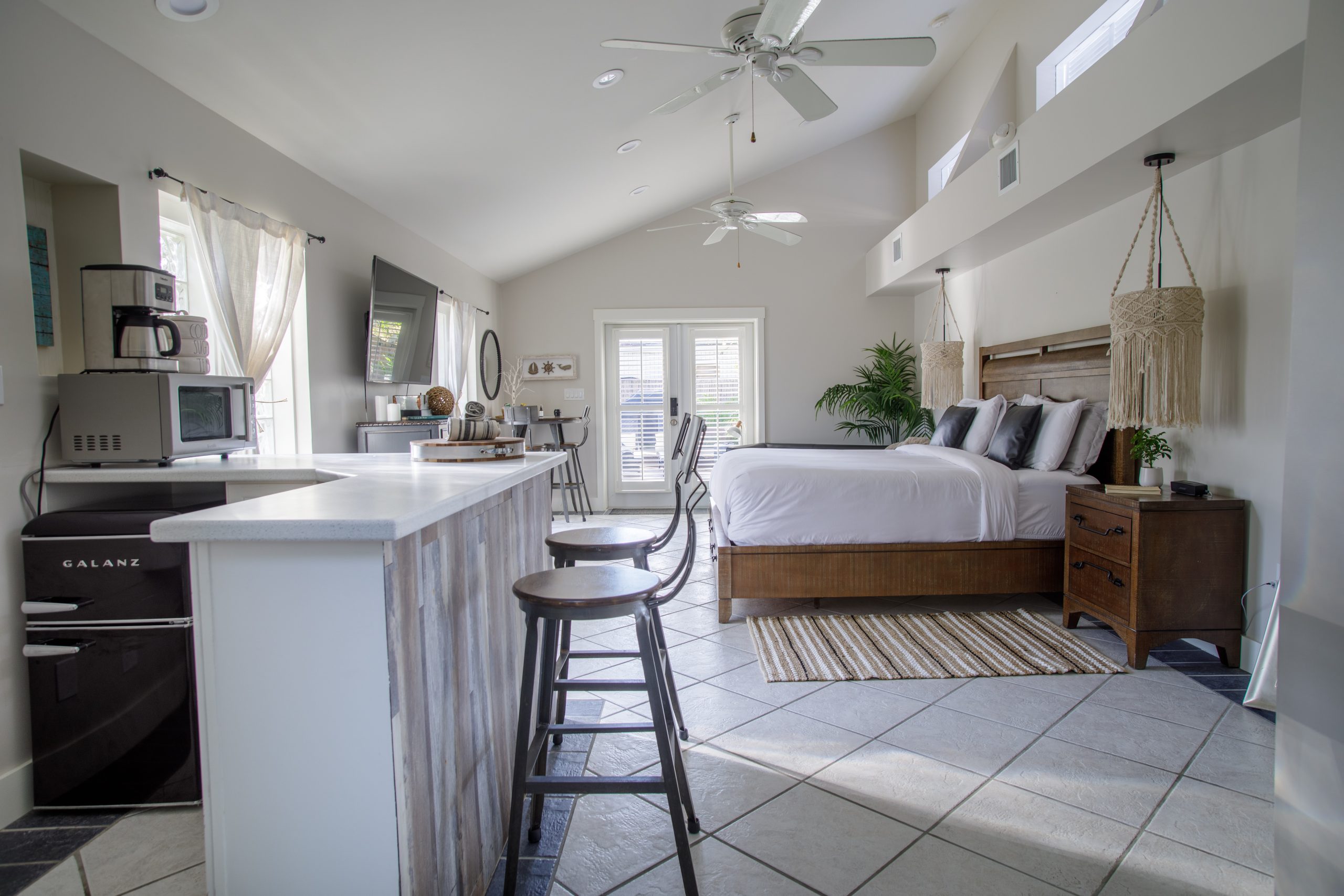 Please Note: The Palm Suite is one of only two guest suites, separate from the Main Residence. The two suites have exclusive use of the lush backyard oasis with tropical trees, plenty of seating areas to enjoy dining alfresco while taking in the natural sounds of local wildlife. There is also a shared propane BBQ on the deck and an additional refrigerator with extra storage and ice located next to the complimentary cruiser bikes! The Palm and Banyan Suites each accommodate a maximum of 2 adults – Special accommodations for children may be made if both guest suites are booked together.