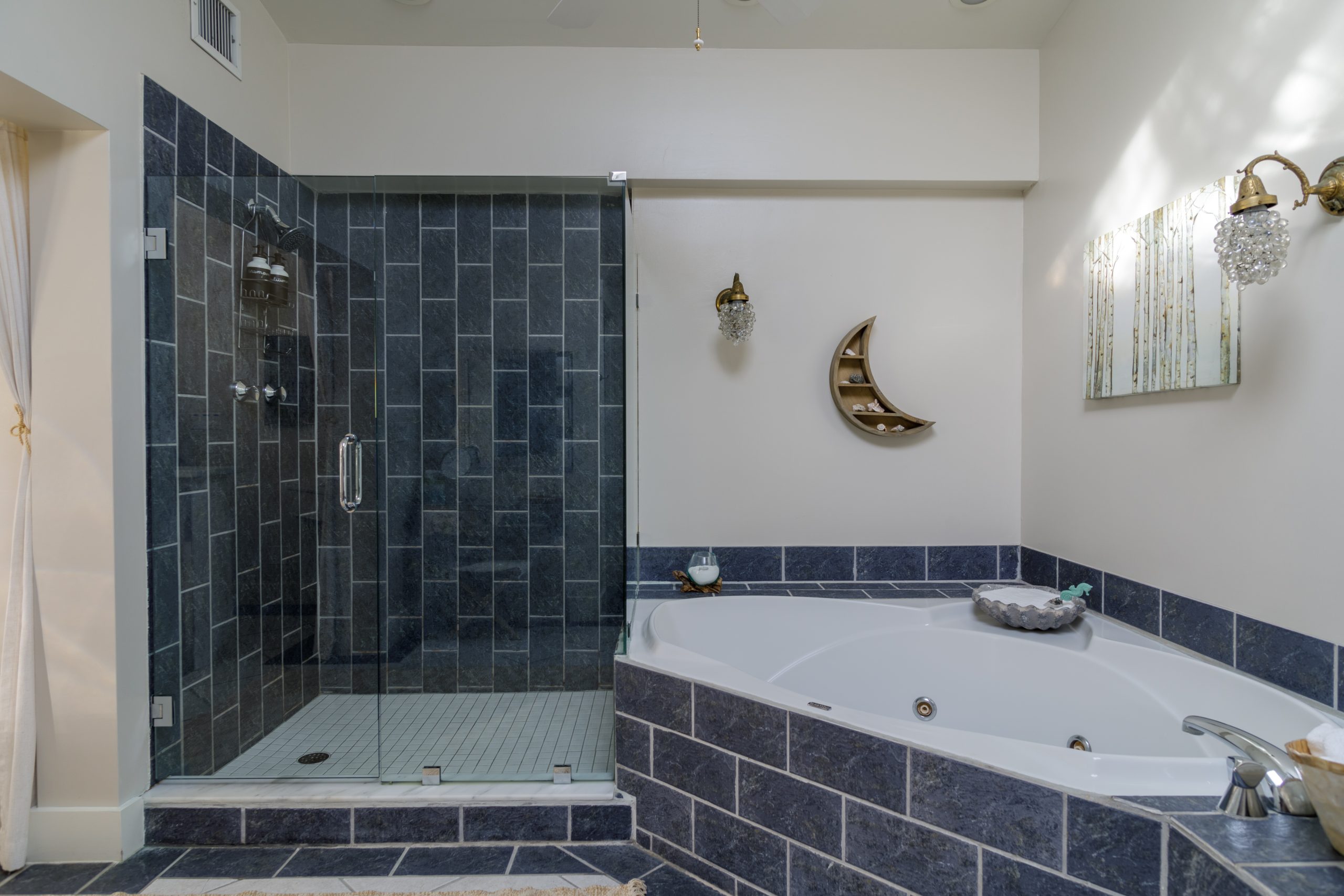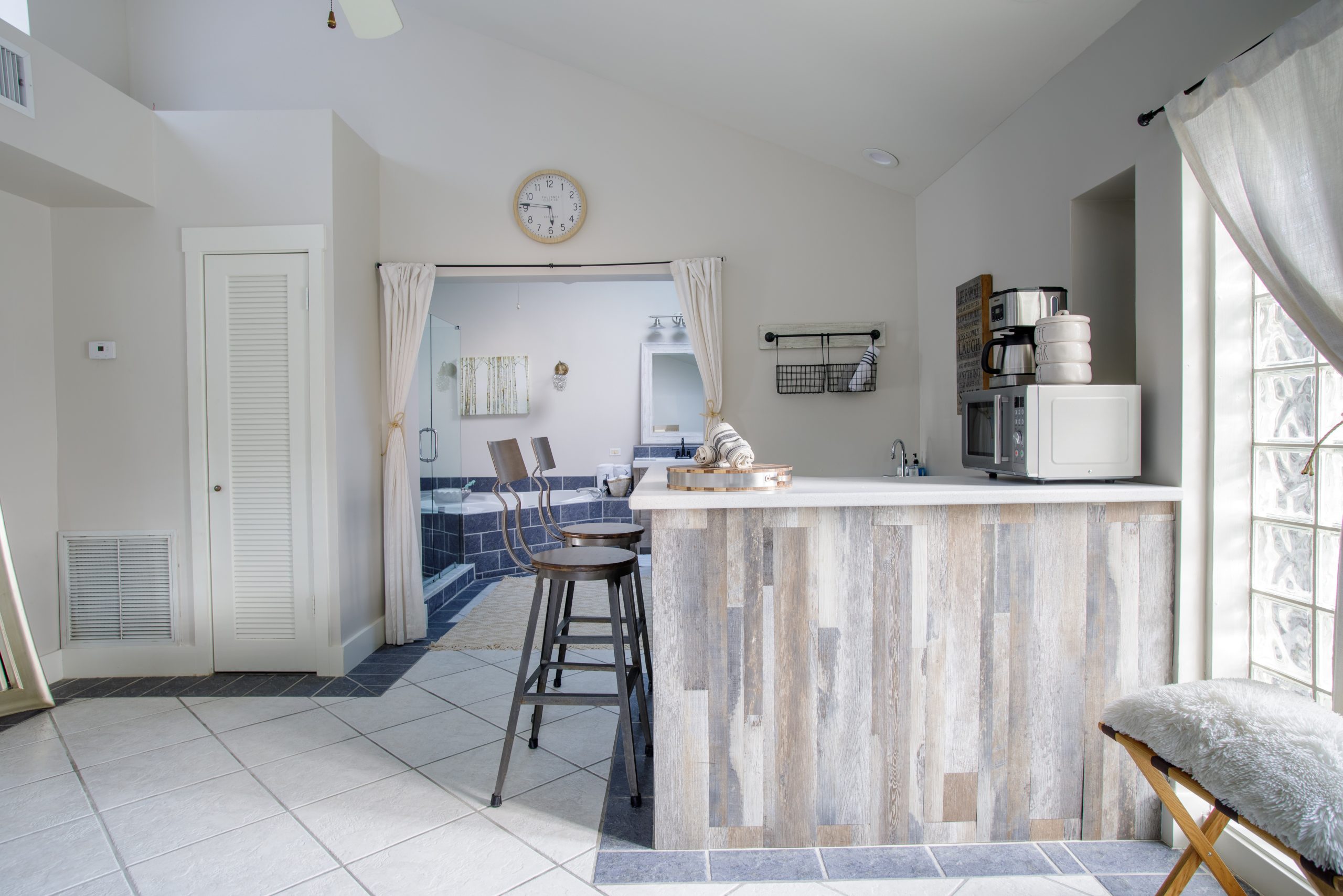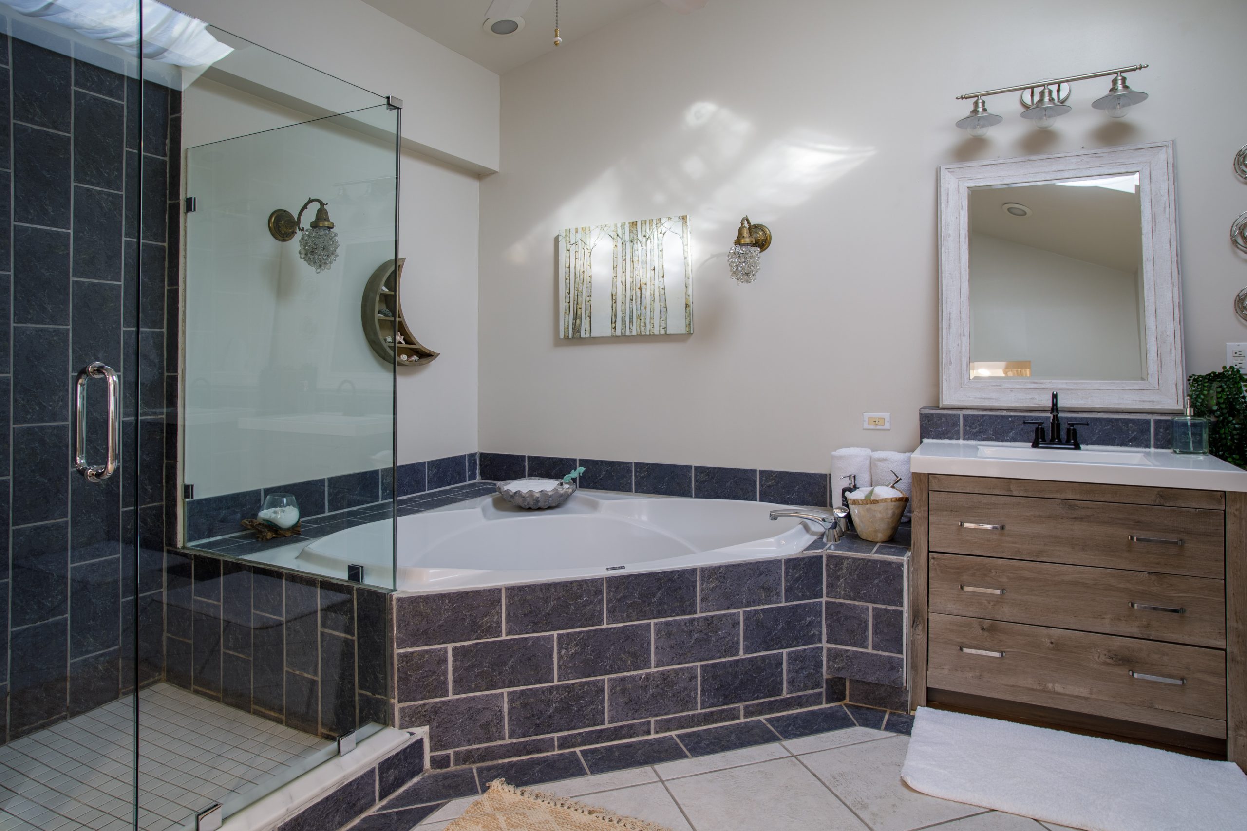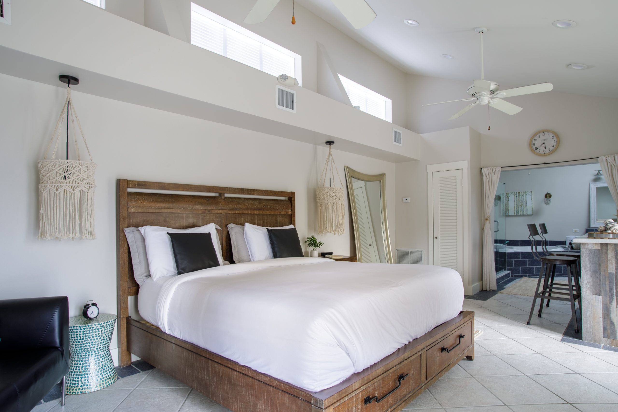 Get lost in the expansive bathroom featuring a luxurious whirlpool tub with bubbles and bath salts, separate glass shower, makeup vanity, and double sink cabinets. Our white all-cotton bath robes allow for an extended spa experience.