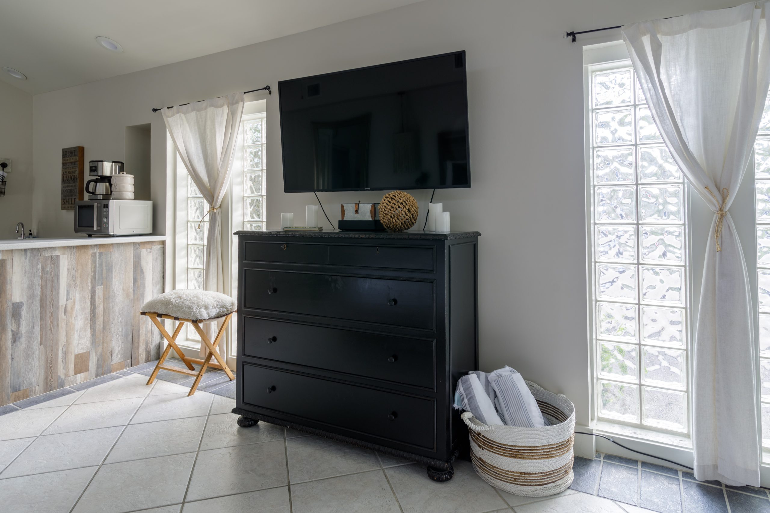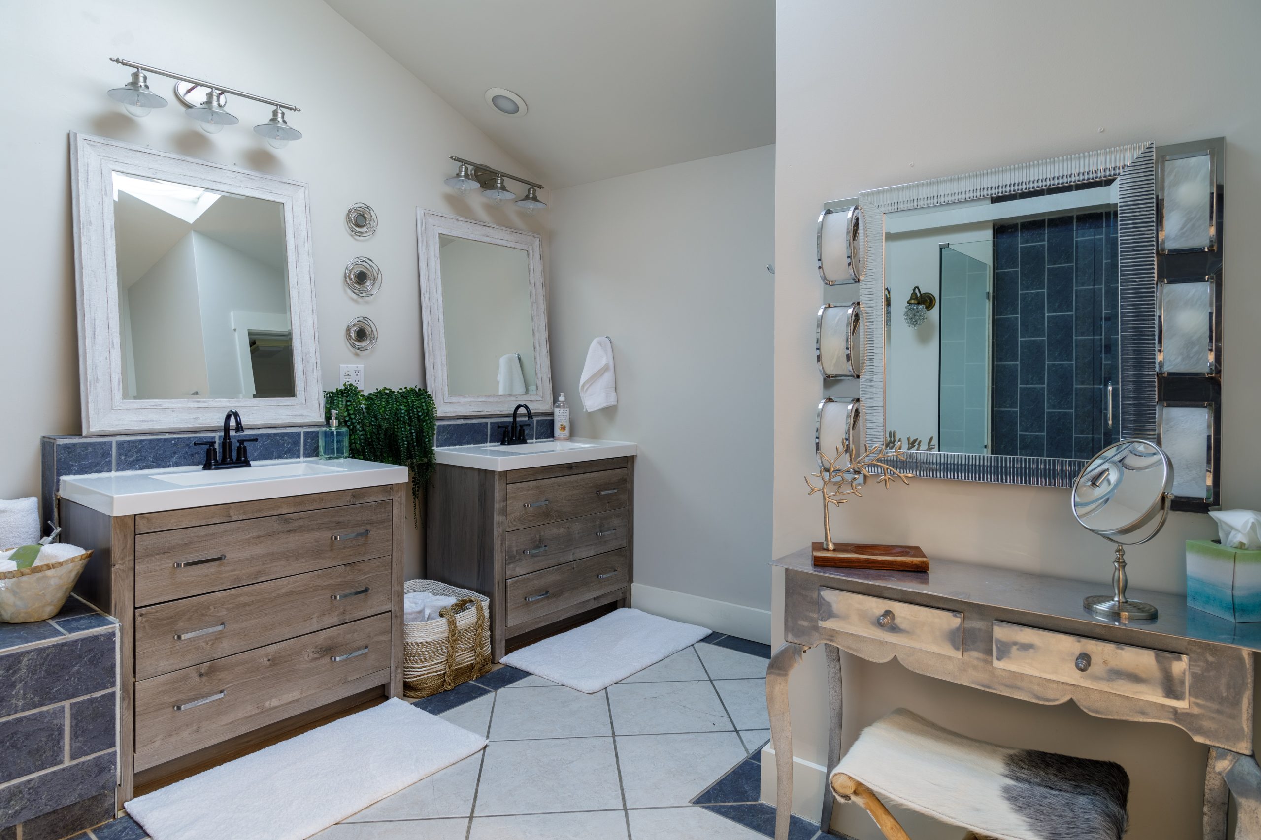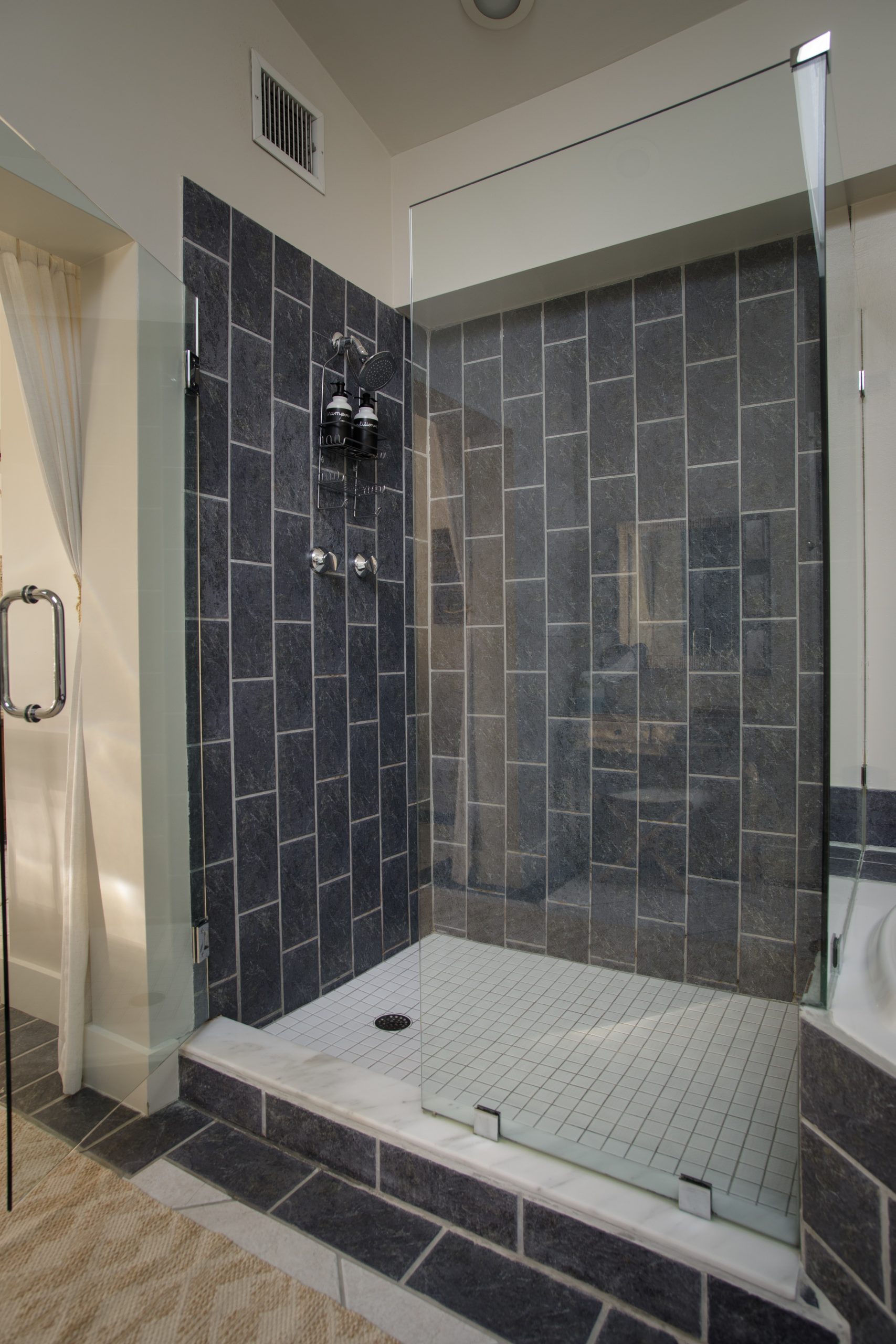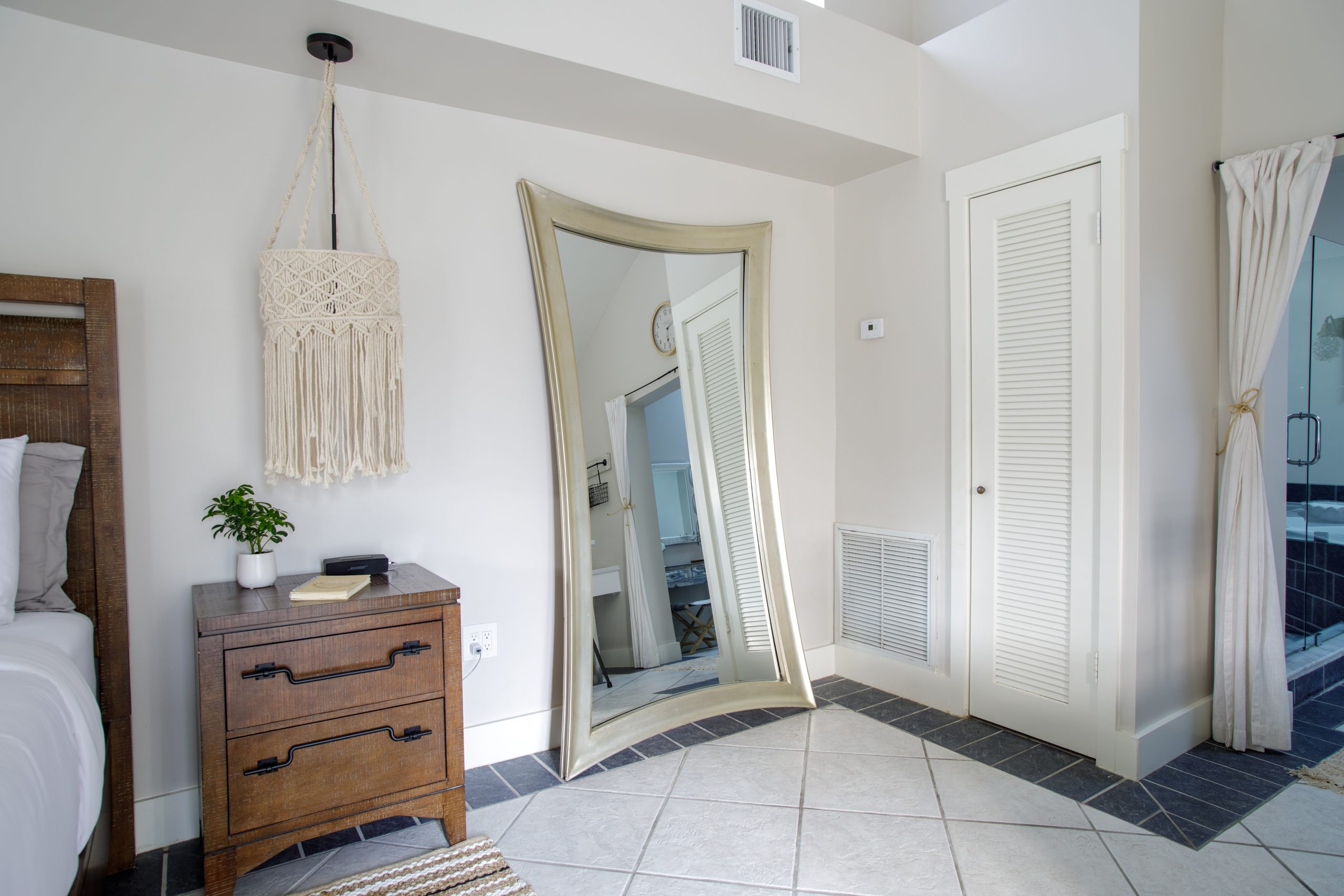 Get lost in the expansive bathroom featuring a luxurious whirlpool tub with bubbles and bath salts, separate glass shower, makeup vanity, and double sink cabinets. Our white all-cotton bath robes allow for an extended spa experience.