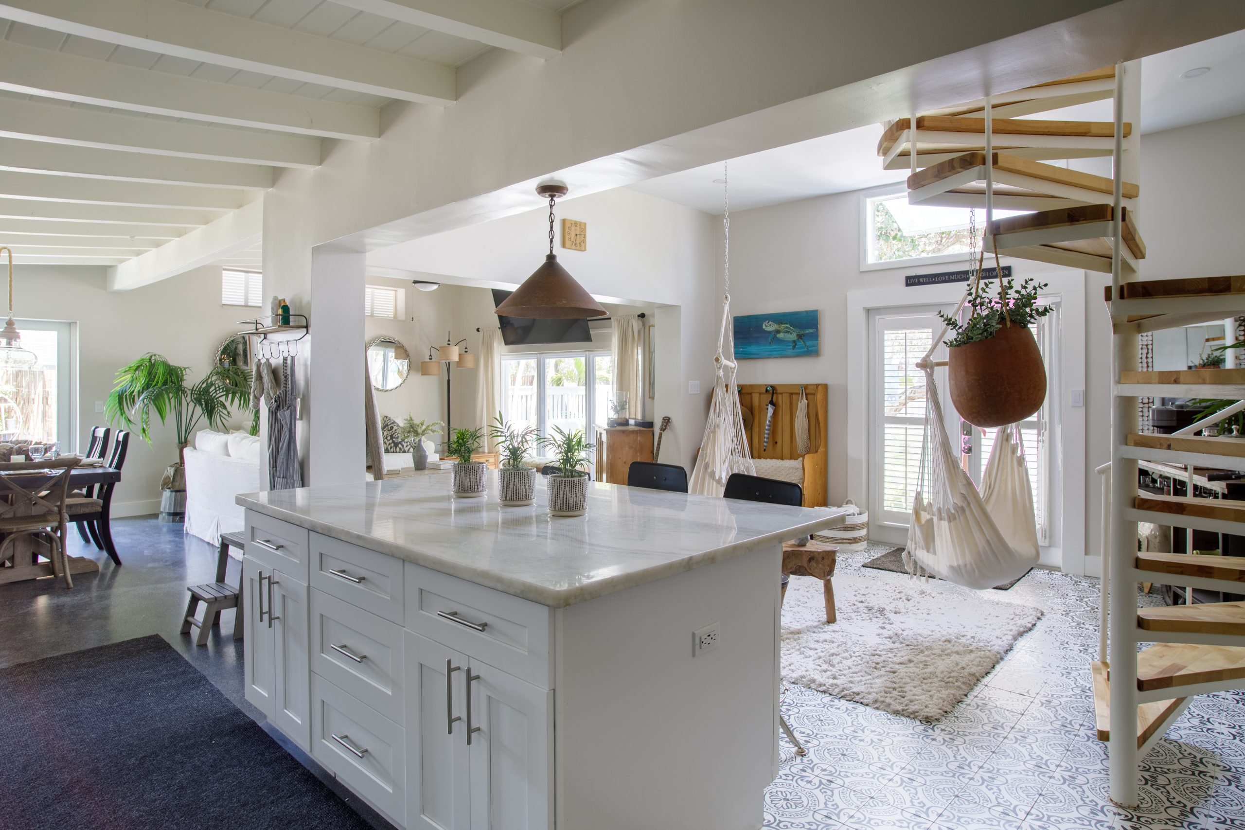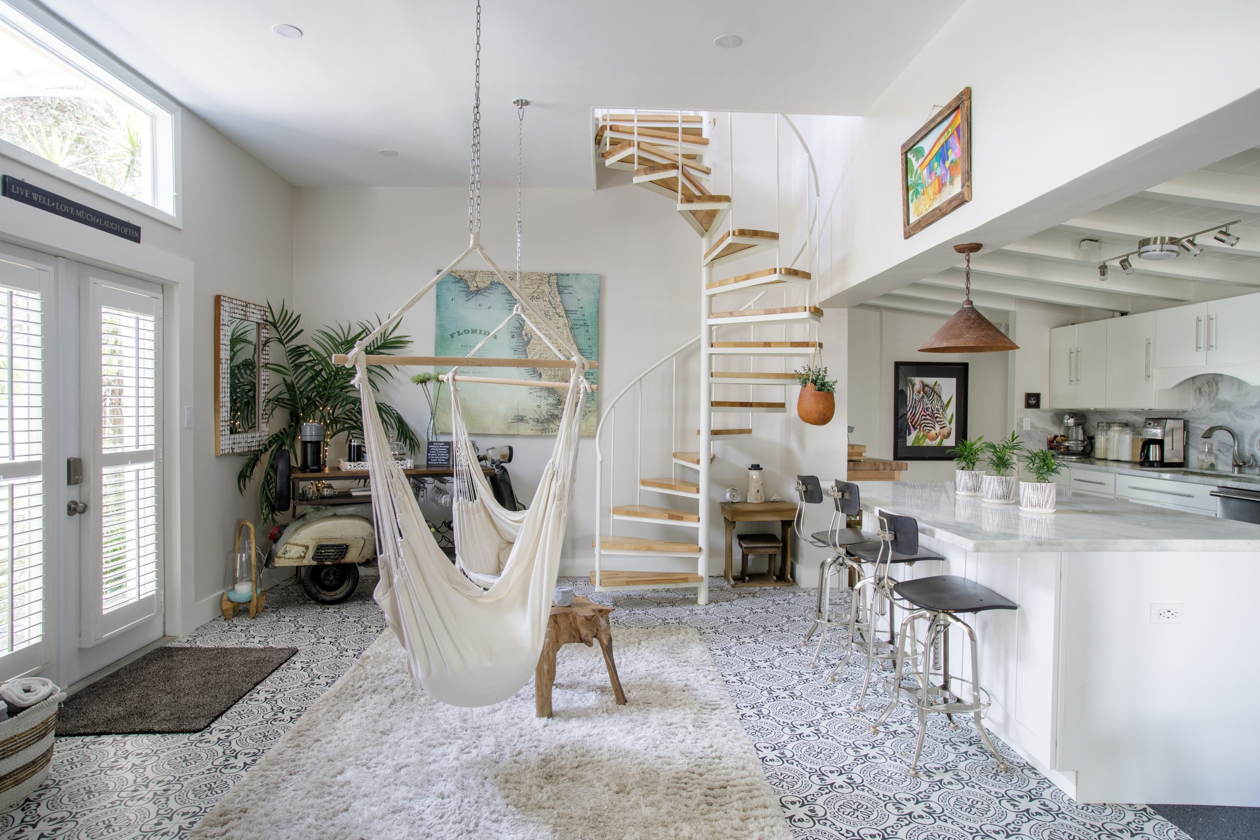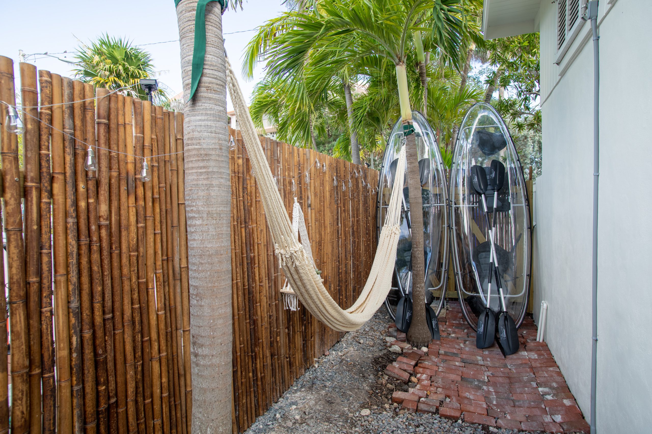 Once inside, you are greeted with hammock swings where you can enjoy morning coffee or afternoon happy hour from your very own scooter bar! Need a break from the 270+ bars and restaurants on Key West? Retreat to your own gourmet kitchen, which features an island/breakfast bar, a full-size Sub-Zero refrigerator, and separate full-sized freezer and ice maker for plenty of stock-up storage! This kitchen also boasts tools for the serious chef that includes a 6 Qt KitchenAid Mixer, Henkel knives, Cuisinart Coffee Maker, and Swiss-made Nespresso machine. The open floor plan into the dining and living room includes a 75” flat screen TV, great for catching up on the outside world or enjoying a romantic movie night.