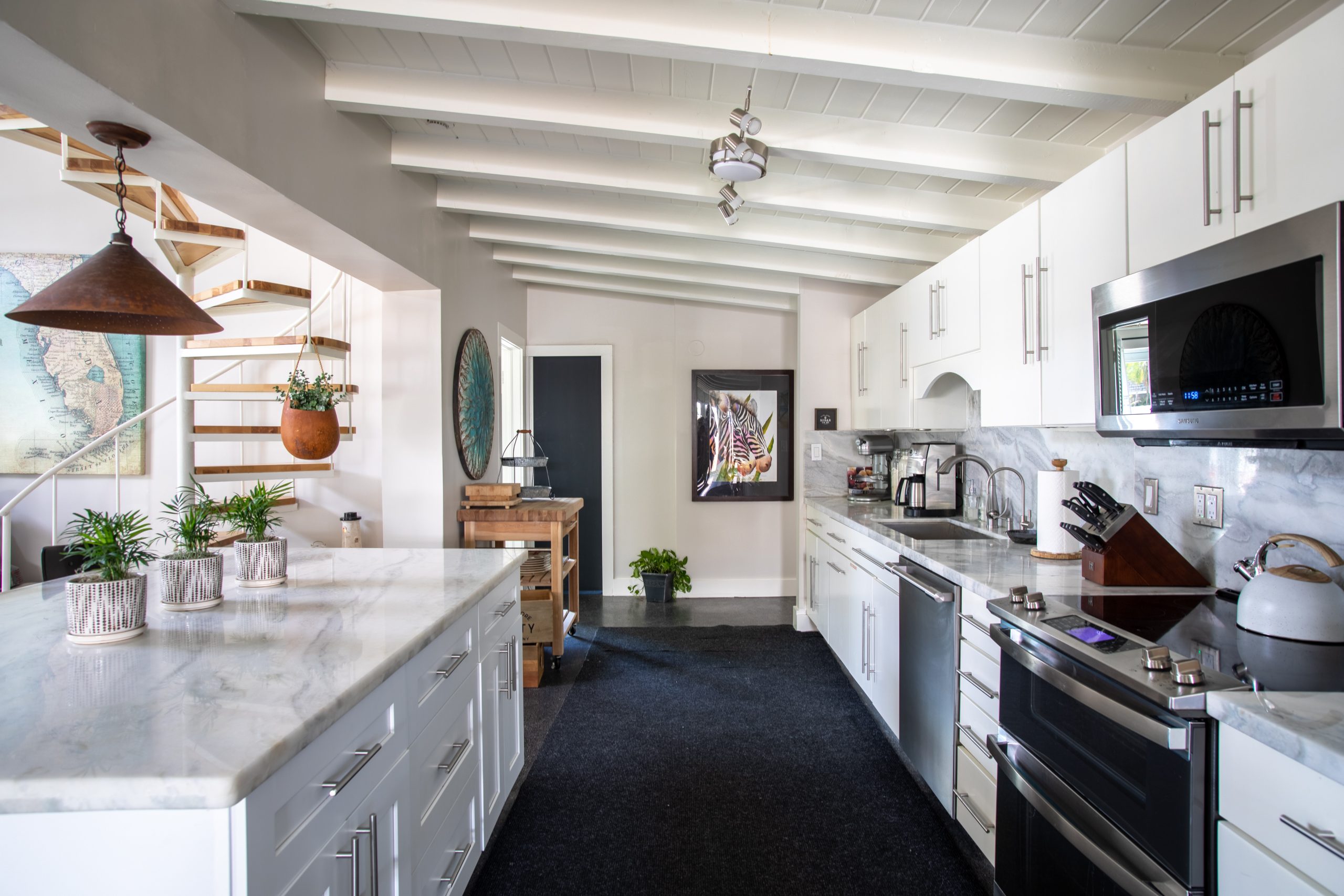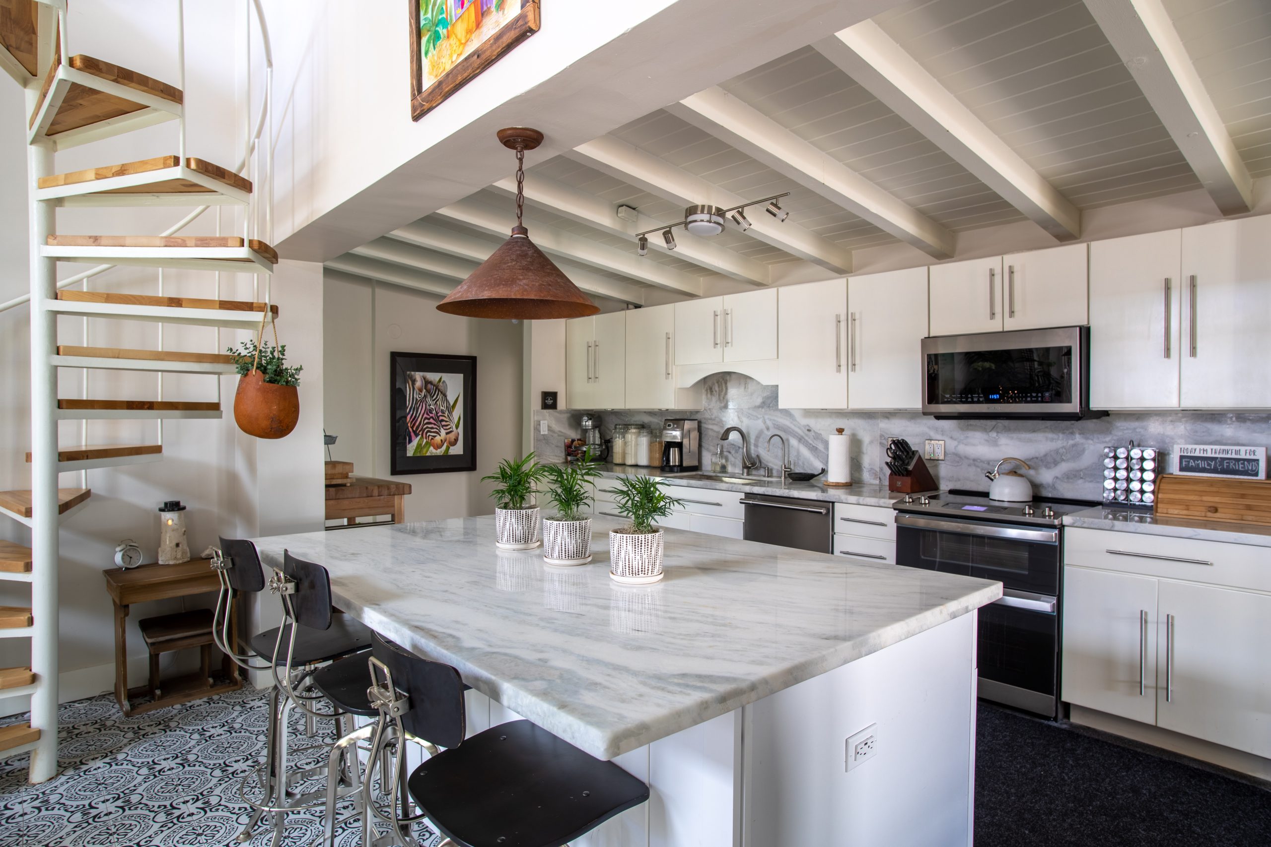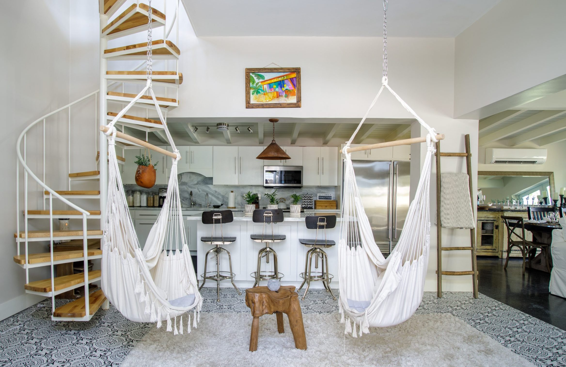 Once inside, you are greeted with hammock swings where you can enjoy morning coffee or afternoon happy hour from your very own scooter bar! Need a break from the 270+ bars and restaurants on Key West? Retreat to your own gourmet kitchen, which features an island/breakfast bar, a full-size Sub-Zero refrigerator, and separate full-sized freezer and ice maker for plenty of stock-up storage! This kitchen also boasts tools for the serious chef that includes a 6 Qt KitchenAid Mixer, Henkel knives, Cuisinart Coffee Maker, and Swiss-made Nespresso machine. The open floor plan into the dining and living room includes a 75” flat screen TV, great for catching up on the outside world or enjoying a romantic movie night.