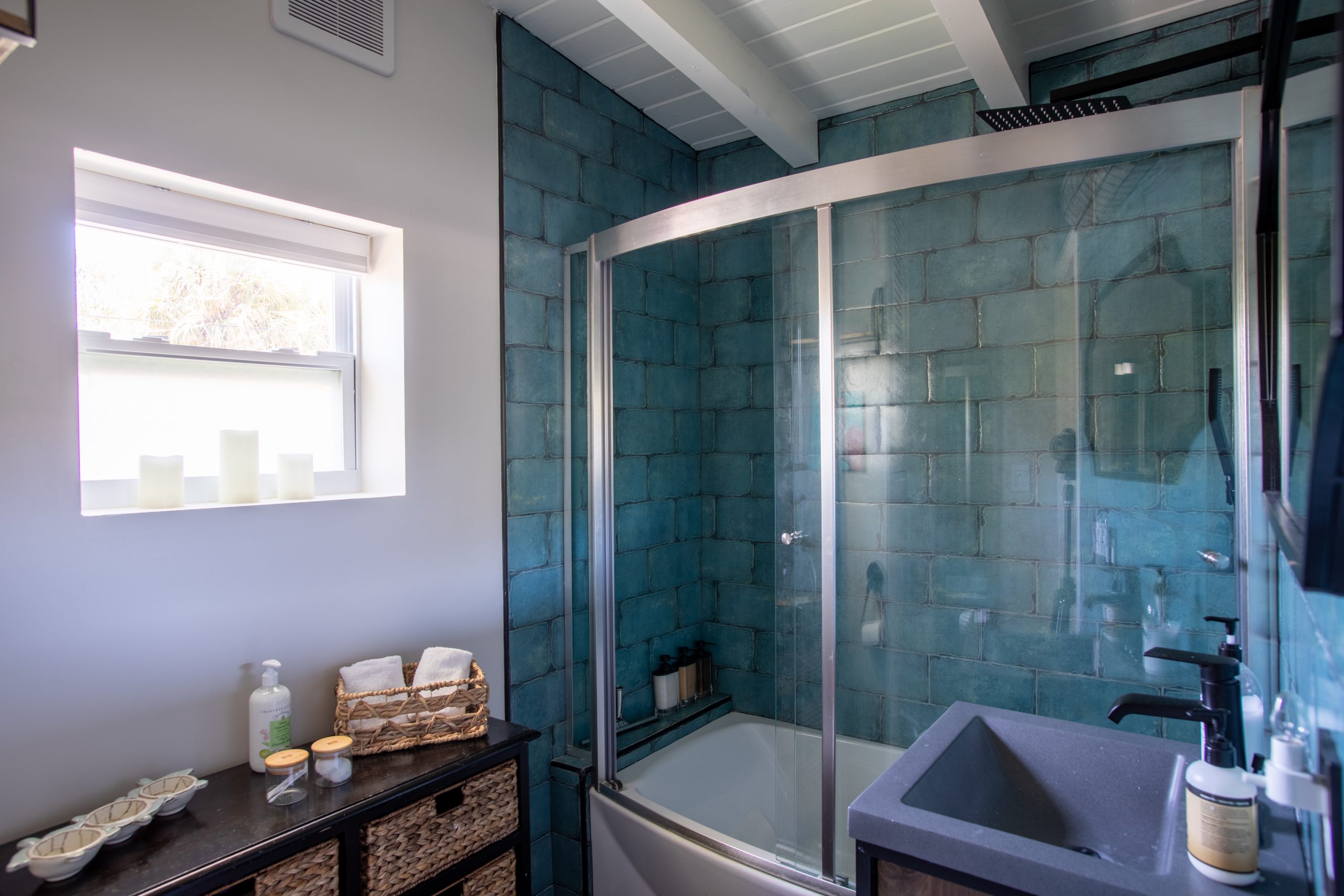 The downstairs California King bedroom provides the ideal respite for slumber. It also features a full wall of built-in closets, a flat screen TV and brand new French doors that open to a lush side yard, fountain, and easy access to the complimentary bikes. It is adjacent to the remodeled bathroom with a rain shower and tub for soaking. Split A/C units in all the rooms ensure a cool escape from a long day of tropical fun.