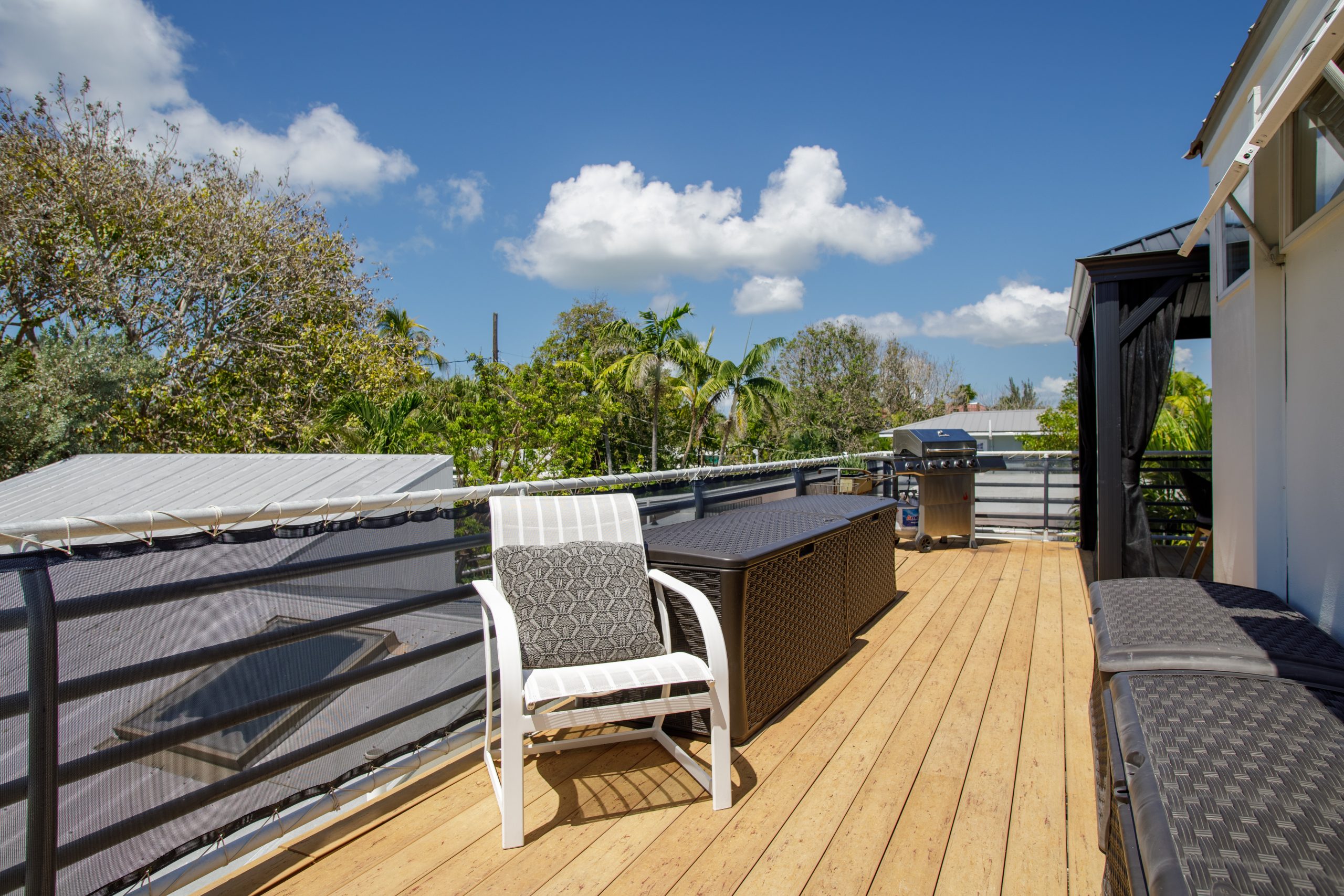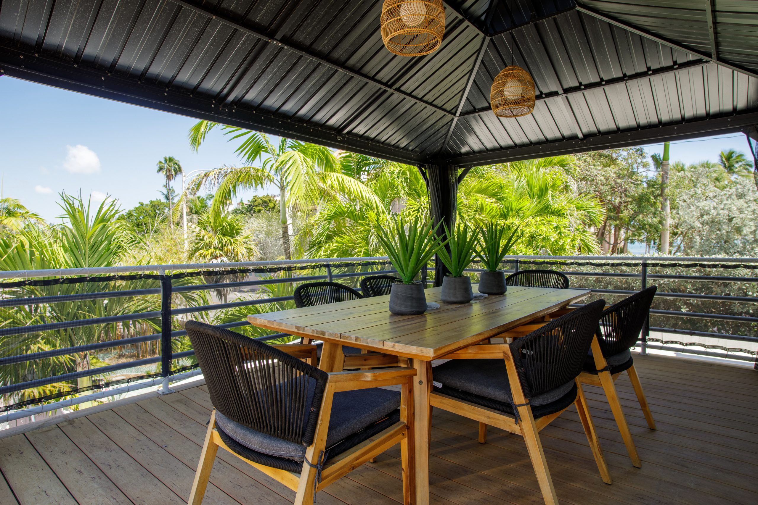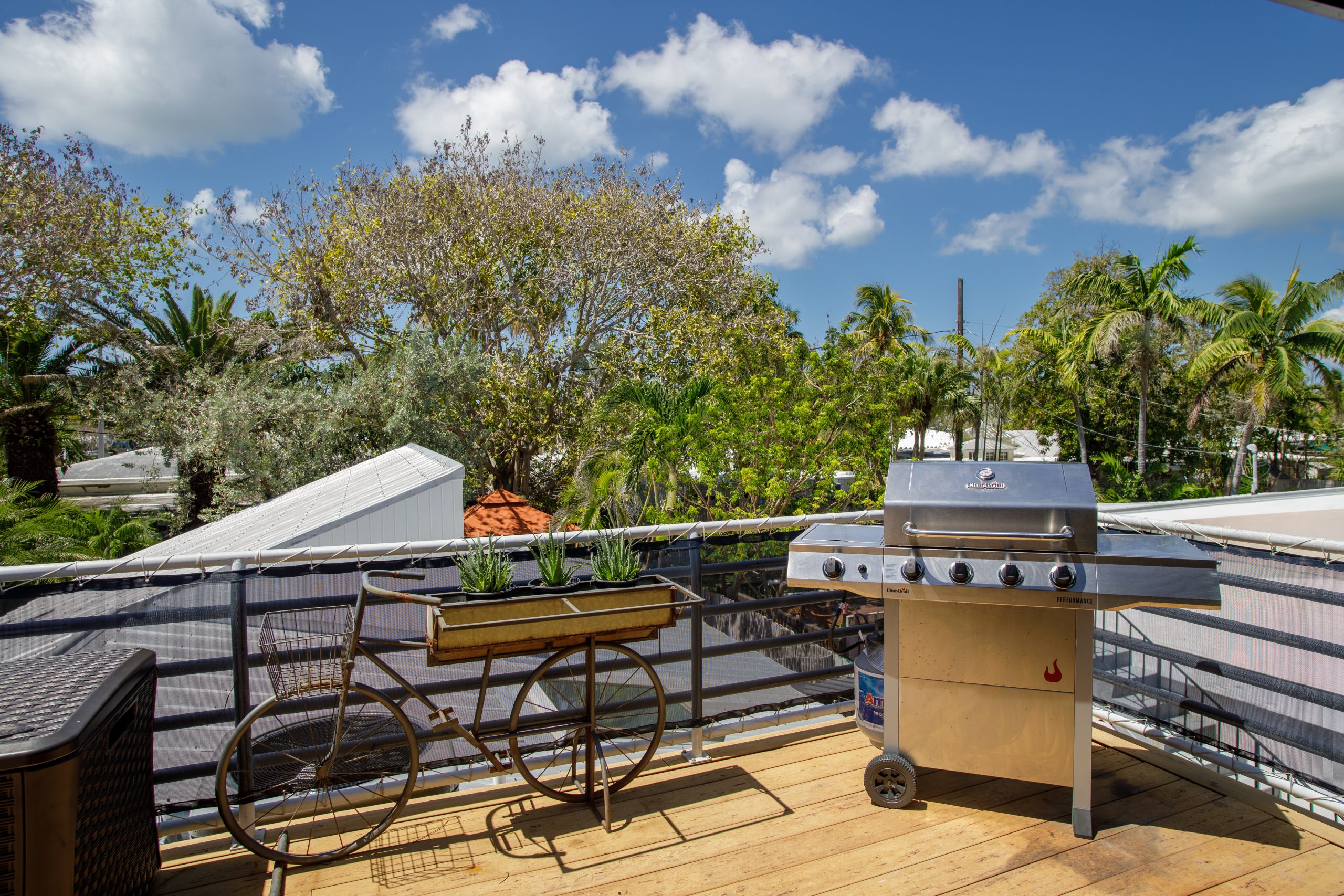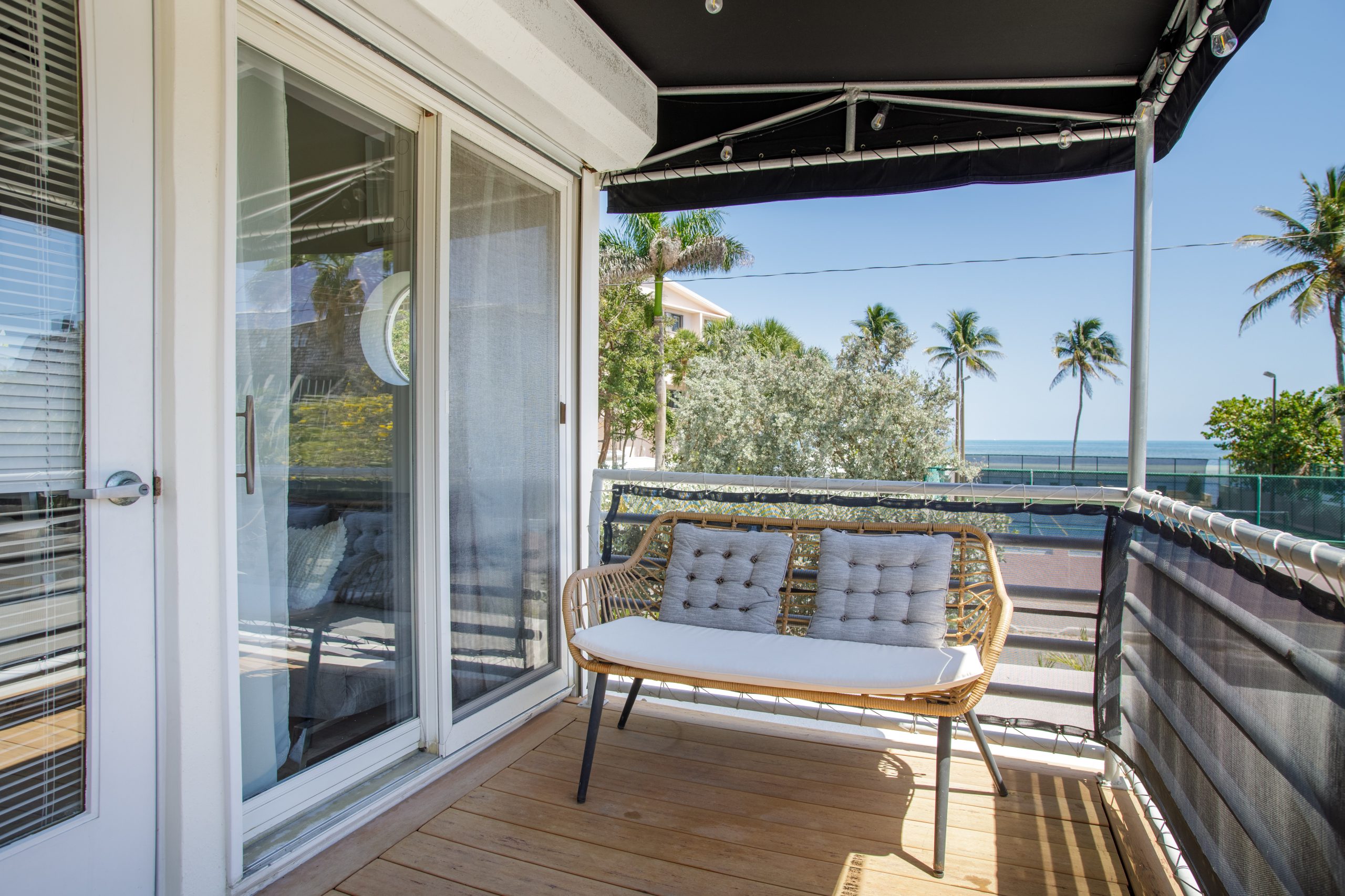 Upstairs, the loft is a peaceful oasis with views! Featuring a queen bed, full-sized foldout futon, and a desk overlooking the blue ocean and beautiful palms. The spacious wrap-around upstairs deck is perfect for winding down or entertaining. One side features a netted gazebo and dining table for 6 as well as a large gas grill with peak views of the ocean. There are also chaise lounges and additional seating on the other side with views of the iconic White Street Pier.